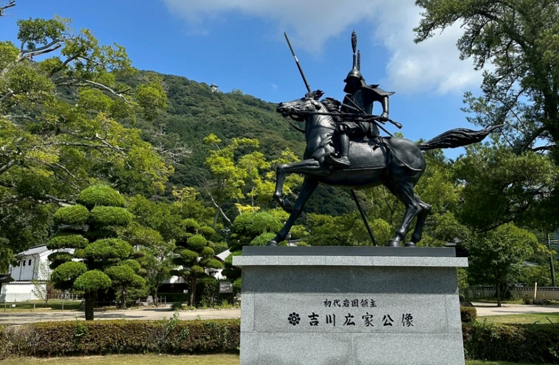吉香公園にある吉川広家公像の正面から写真を撮ると、ちょうど岩国城が映り、像と城のコラボ写真を撮ることができます。