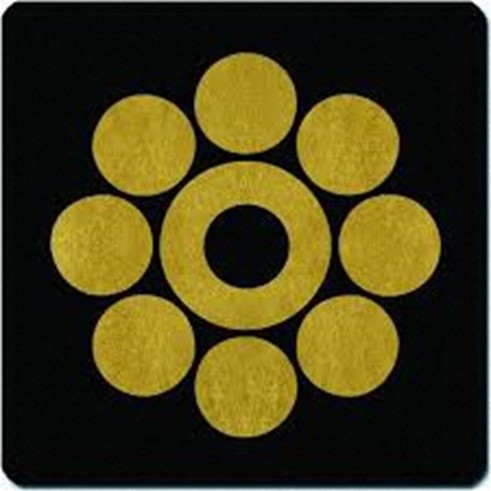吉川九曜紋は、星・曜をモチーフにして、「蛇の目」の周りに8つの星を巡らせて「九曜」の形になっています。