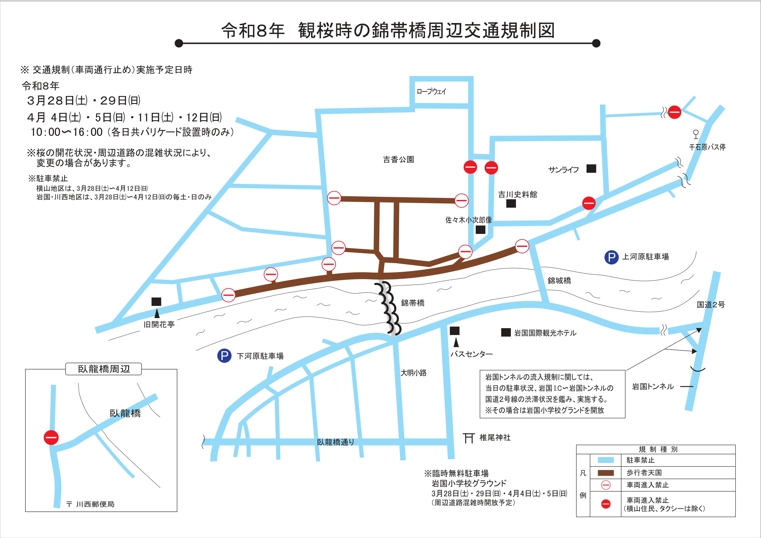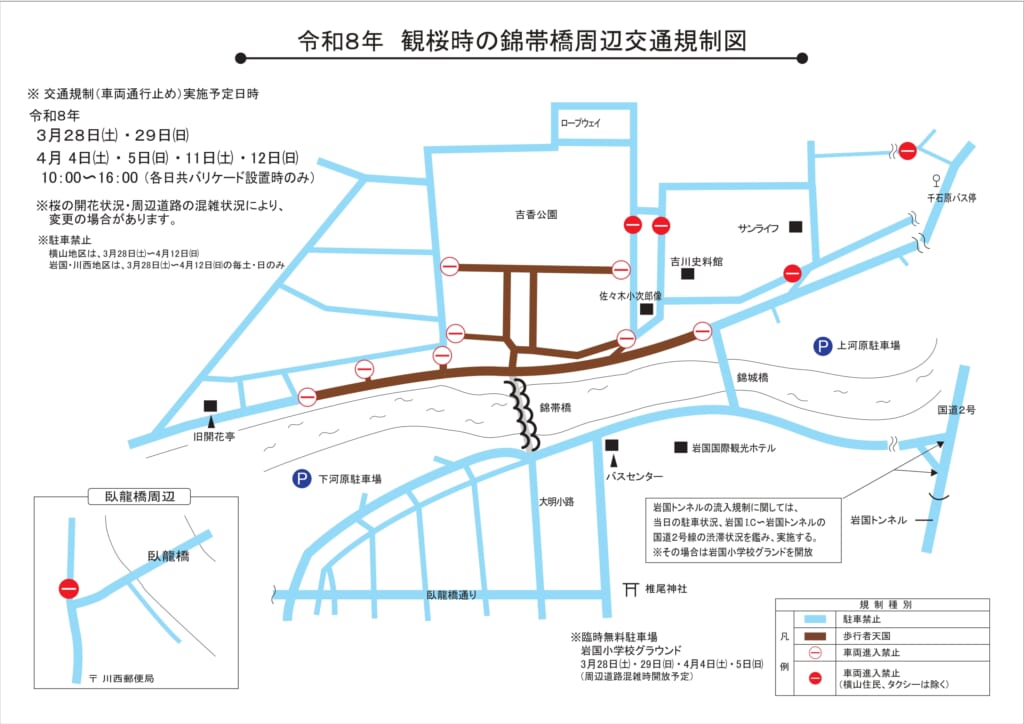 観桜期の錦帯橋周辺交通規制について 令和8年3月28日(土)~4月12日(日)の間(桜の開花状況により変更の場合あり)、錦帯橋周辺は大変な混雑が予想されますので、交通規制が行われます。 期間内の土・日に関しては横山地区の車両進入禁止措置(バリケード設置時のみ)が行われる場合もあります。 交通規制図について下記をご覧ください。 訪れる際は公共交通機関を利用してください。 【お問い合わせ】 岩国市観光振興課 0827-29-5116 岩国市観光協会 0827-41-2037 関連スポット・トピックス Spot of relation岩国国際観光ホテル 錦帯橋温泉「いつつばしの里」篤姫も渡った 錦帯橋三士誠忠の碑(さんしせいちゅうのひ)3/13(金)~ 錦帯橋ライトアップの実施について新港(しんみなと)岩国れんこん