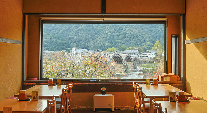 2階席からは大きな窓越しに風情ある錦帯橋の景観を望めます。1階はカウンター席です。